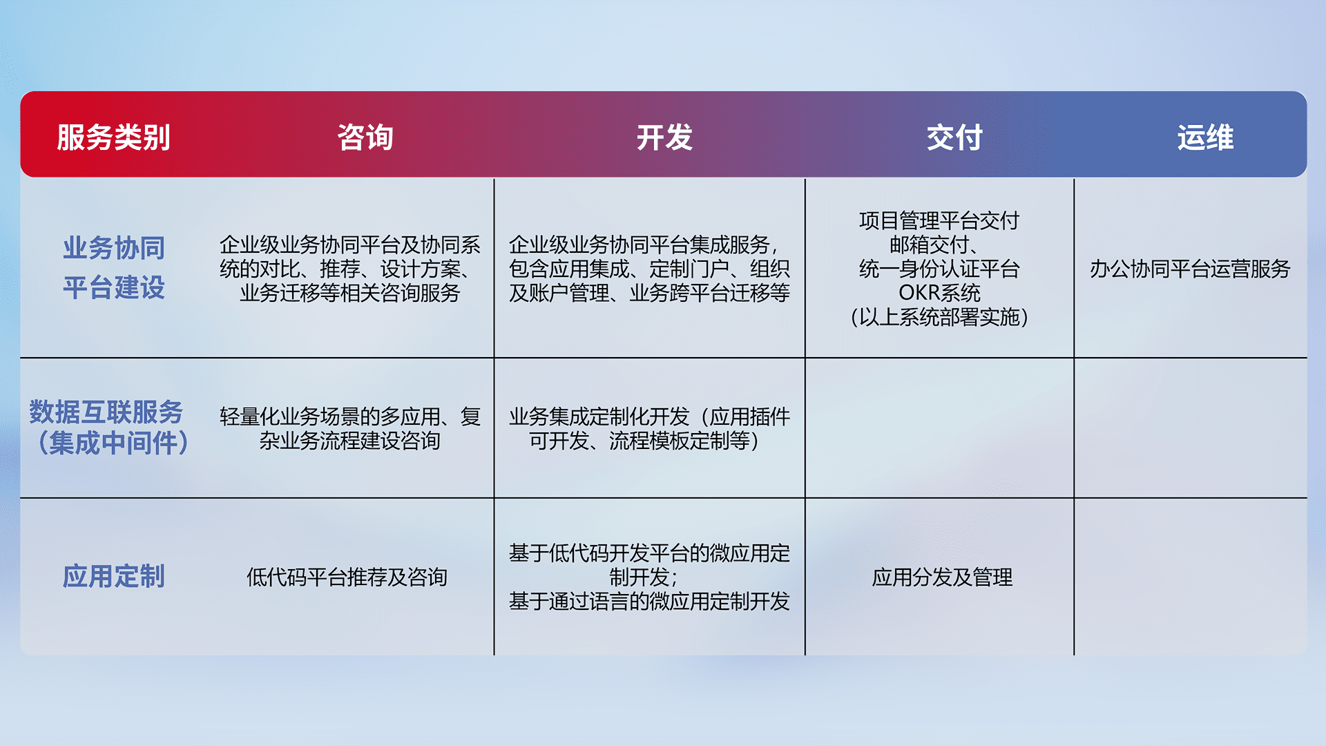 针对钉钉、、、、企微、、、IDaas等平台级产品提供产品的规划、、、方案、、交付、、、、定制化开发等服务,,,,实现如统一协同办公、、、智能客户服务、、混合会议管理、、、、智能数据查询、、、等业务场景,,,,实现数字化转型。。。。
