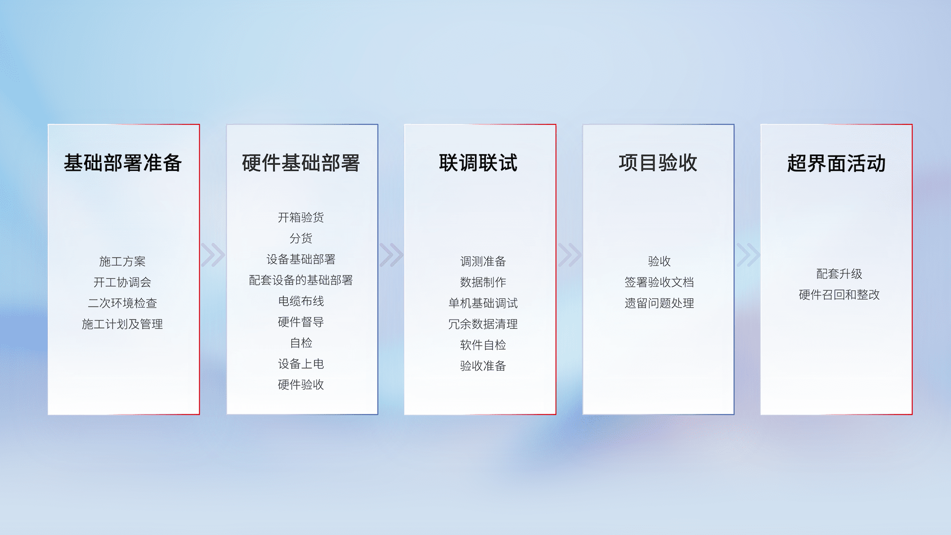 从基础部署准备、、、硬件基础部署、、联调联试、、、项目验收、、、、越界面活动的全过程可追溯,,,保证施工质量和进度。。。
